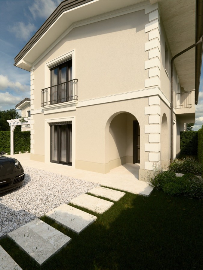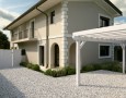 Dall’ingresso, protetto da un portico coperto, si accede a